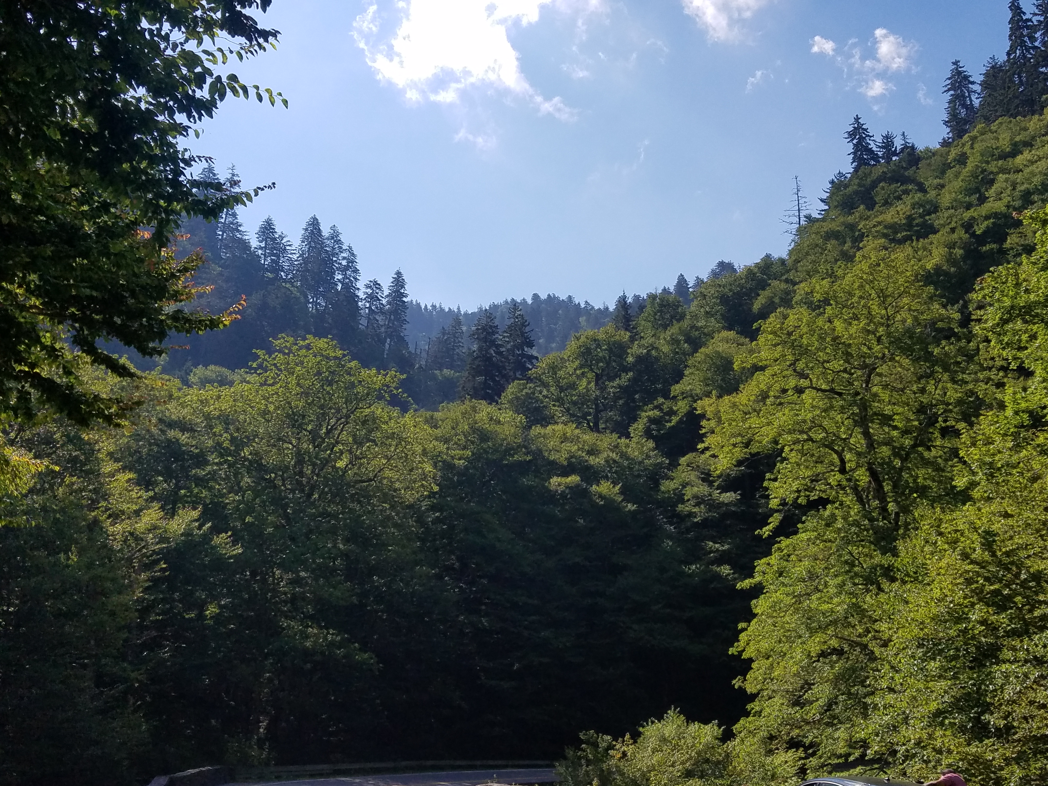 Monday morning we headed to the Great Smoky Mountains National Park to scout out a place for watching the eclipse; apparently hordes of others had the same idea, though, so we drove on south through the park into Cherokee, North Carolina to try to find a better spot. A campground that we discovered was equally full, so we followed the road through the mountains out of town. It seemed like every field was packed with cars and people, camp chairs set out and waiting. We drove on.