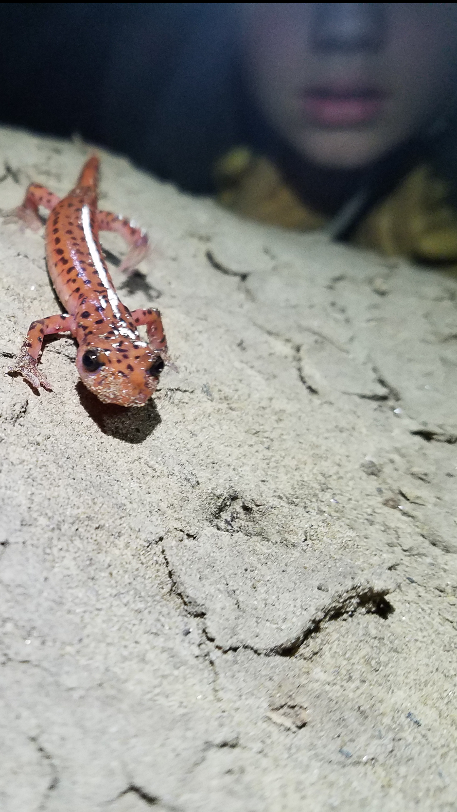 In the midst of the breakdown in the entry, we found a drop-down to a passage extending nearly perpendicular from that front room which then split off into a few directions, many of which looping back around to the starting point. Aside from a large, curious salamander, we didn’t find much down there and returned to the upper level. To the left of the breakdown room was another passage, roomy with a ceiling some twenty or thirty feet overhead, which led into a second breakdown room sloping down to the stream level, which gushed out from between the rubble at the lowest point.