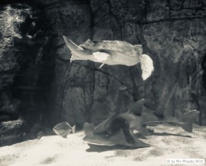 When this shark swam above me it was like a cloud passing over the sun. The sand tiger shark is another creature found in the aquarium, a shark that can reach up to ten feet long and whose vicious-looking teeth belie its personality. This nocturnal predator is much more interested in having fish for dinner than humans, and it is particularly notable as the only species of shark known to surface and gulp air, which is then stored in their stomachs to help them maintain neutral buoyancy. As a fledgling SCUBA diver, I totally understand the need.