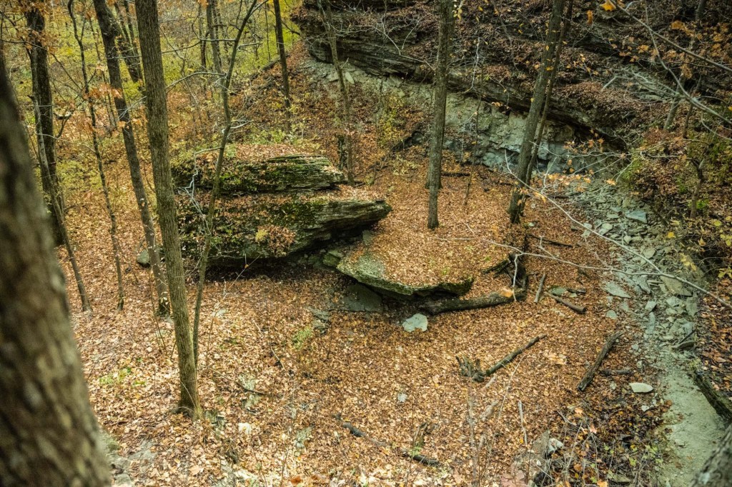 We took the loop trail at a mosey, as it was only a couple of miles long. Light shone gold through the beech leaves still clinging to branches overhead. The reason ACRES chose this property was obvious as we followed the creek along: Dramatic outcroppings of rock could be found throughout the area that look almost like karst topography, where caves can be found, though there are none in northern Indiana. This is instead the result of massive amounts of glacial meltwater carving channels and terraces through the rock when the Wisconsonian ice sheet retreated.