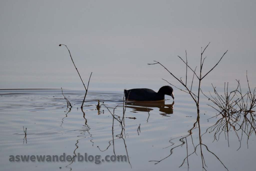 This golden-hour image dates from early March of 2023 and I love how the ripples on the water blend perfectly into the soft gradient of clouds in the sky. The bird, with its broken reflection in the ripples and forehead shield catching the light to give a cyclopean vibe, makes the image feel even more surreal.